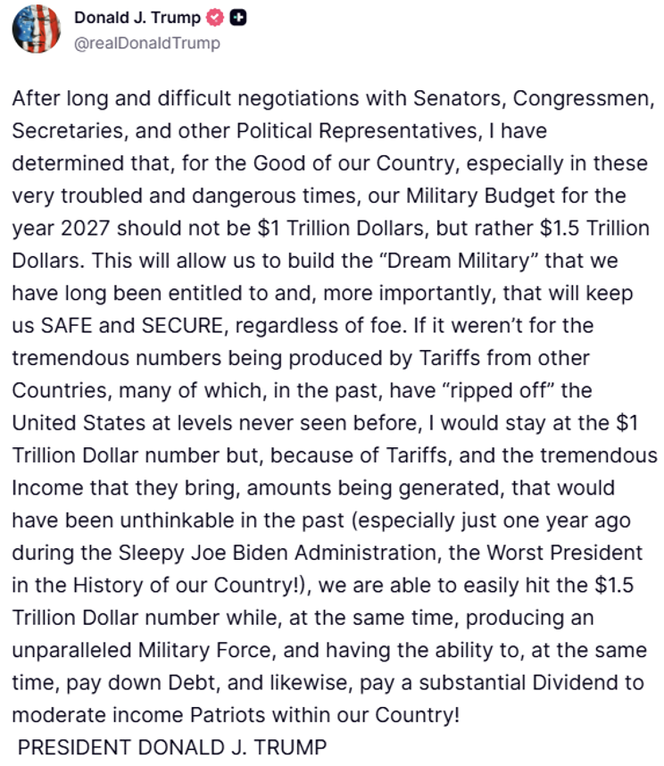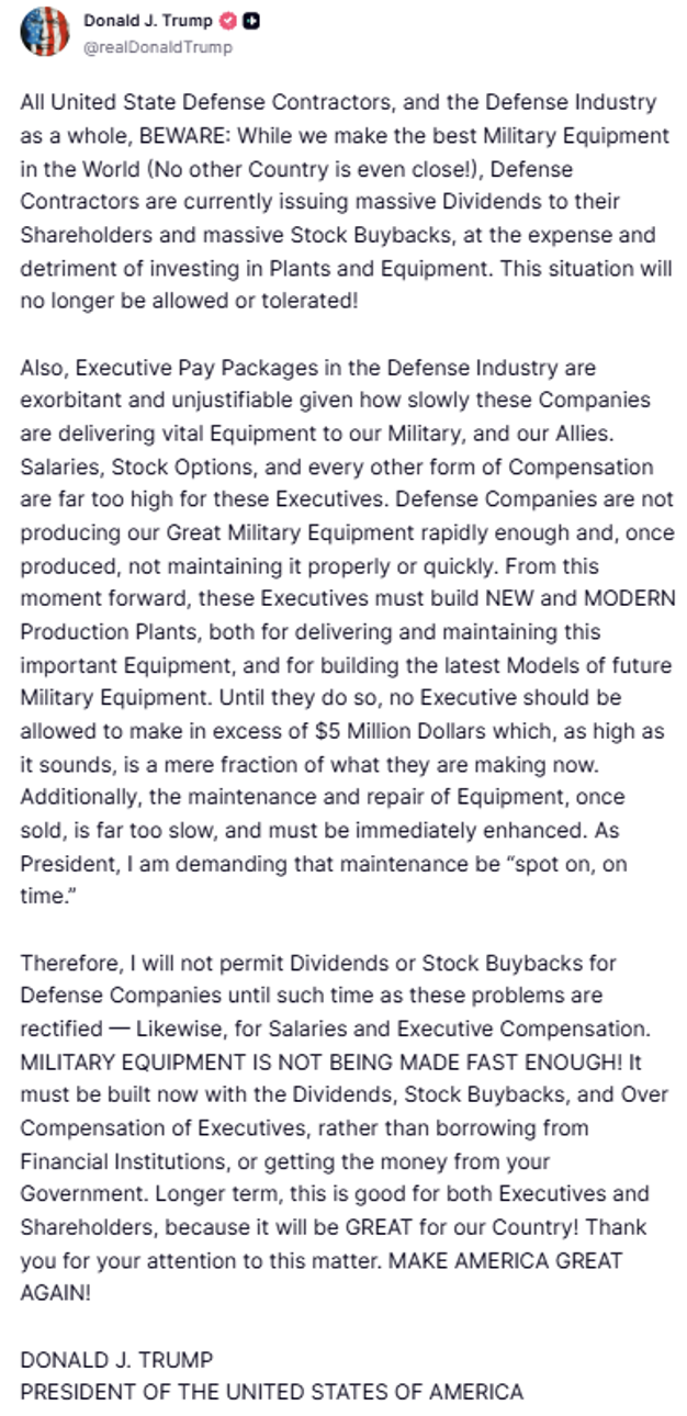 “Trump says he will not permit dividends and stock buybacks for defense companies” – CNBC