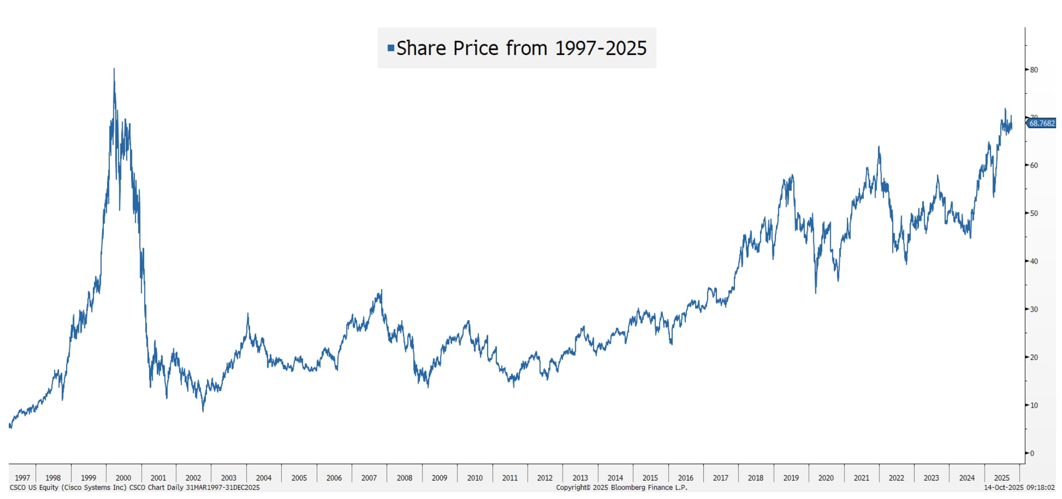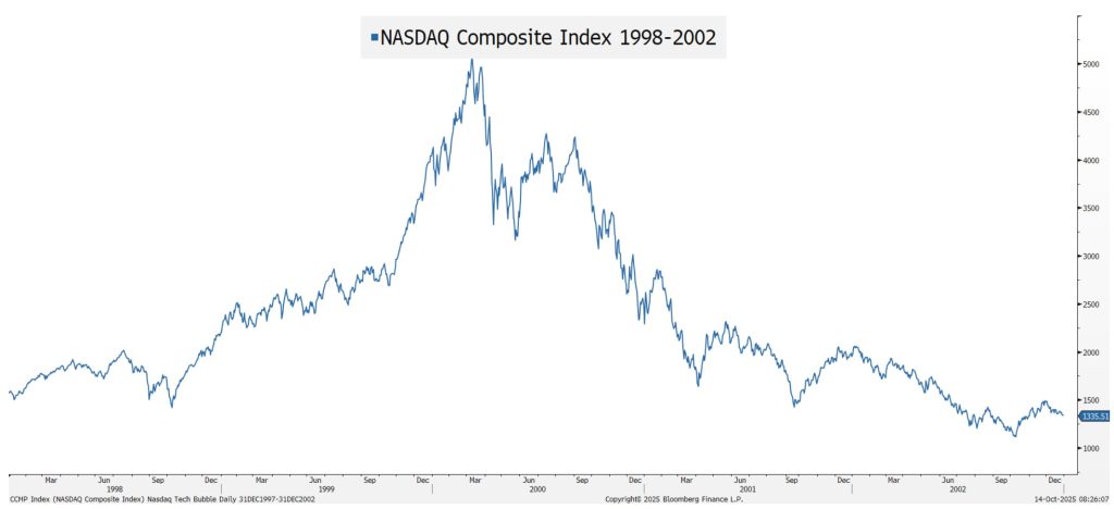 In the late 1990s, investment poured into fiber optics, network equipment, and web infrastructure—much of it based on wildly optimistic projections for internet traffic and demand. Many companies of that era failed; those that survived often took years to recover. One well known networking technology company is a telling case study. As the physical backbone of the internet, this company’s routers and switches fueled explosive growth—and its stock reflected that optimism. The company even financed many of its customers’ purchases, creating a circular economy that proved unstable when the bubble burst and many of their customers failed. This company’s shares ultimately fell 80% and, remarkably, have yet to revisit their 2000 highs.